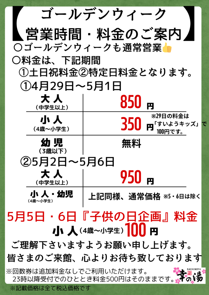 ゴールデンウィーク 営業時間・料金のご案内