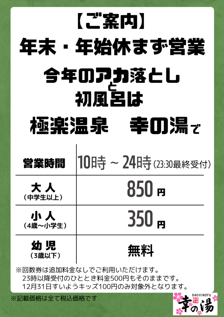いつも極楽温泉 幸の湯をご利用いただき