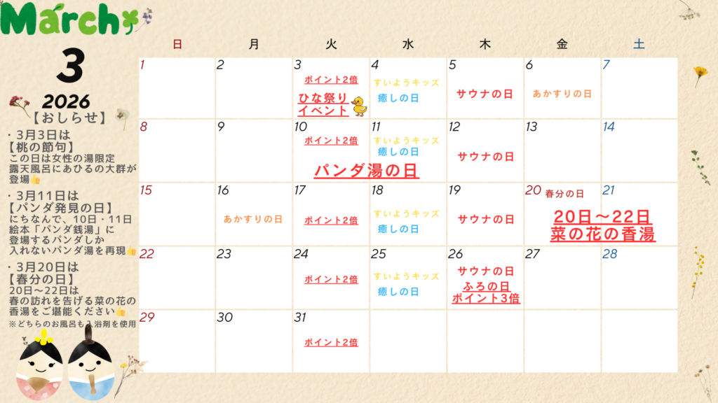 〇あかすりの日 60分以上のコースで入浴無料券プレゼント